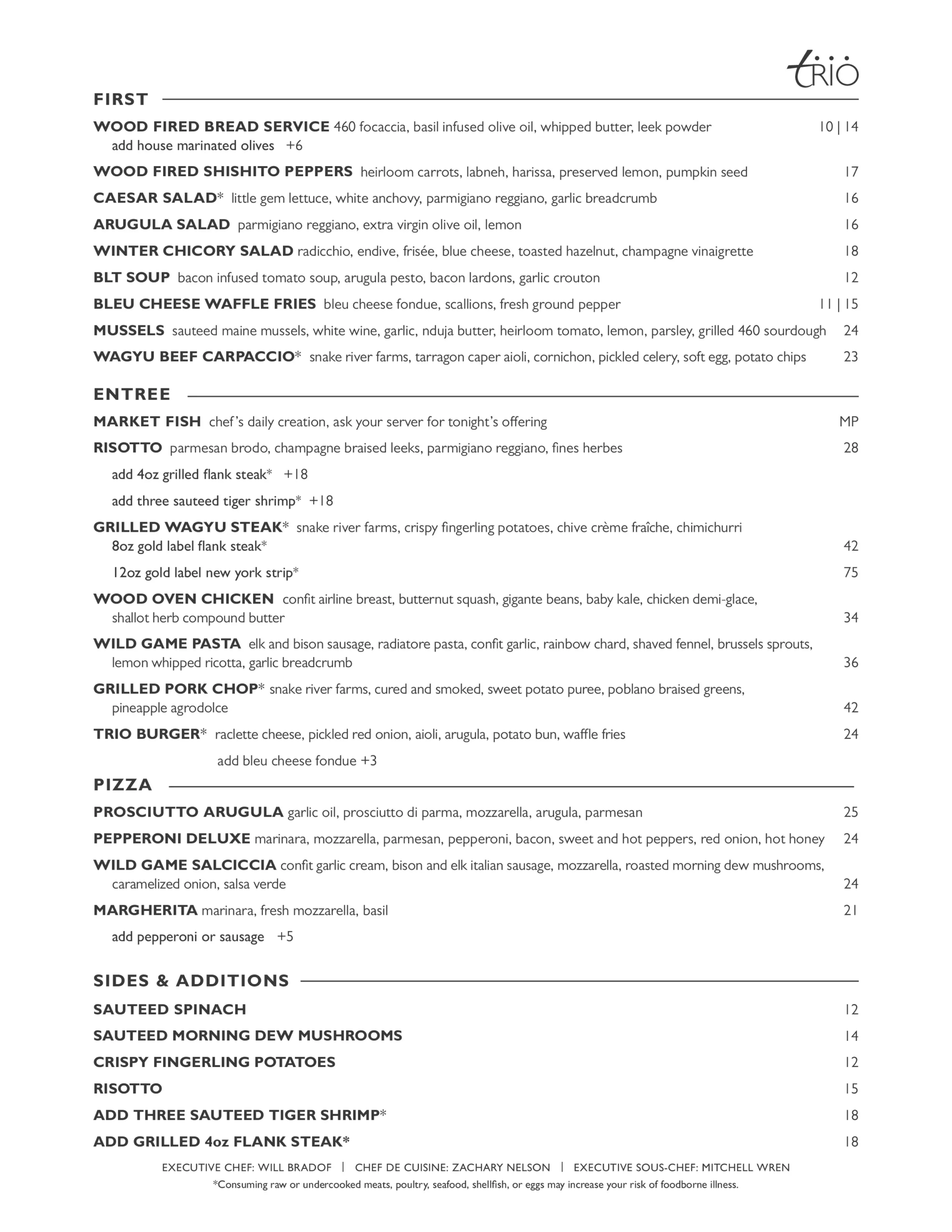 Upon graduating from Colgate University, Will established his connection to Jackson while cooking in a number of local establishments. Deciding he wanted to take his skills to the next level, Will enrolled at the Culinary Institute of America. After graduation, with apprenticeships in Tuscany, Italy, and at Tra Vigne restaurant in Napa, CA, Will returned to Jackson for a position at the Snake River Grill. Will quickly became one of the Snake River Grill’s integral chefs, spending a year and a half developing his unique style and technique, before opening Trio.